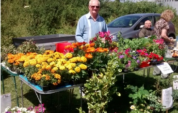 Left: at a fete, presenting plants from a church stall.